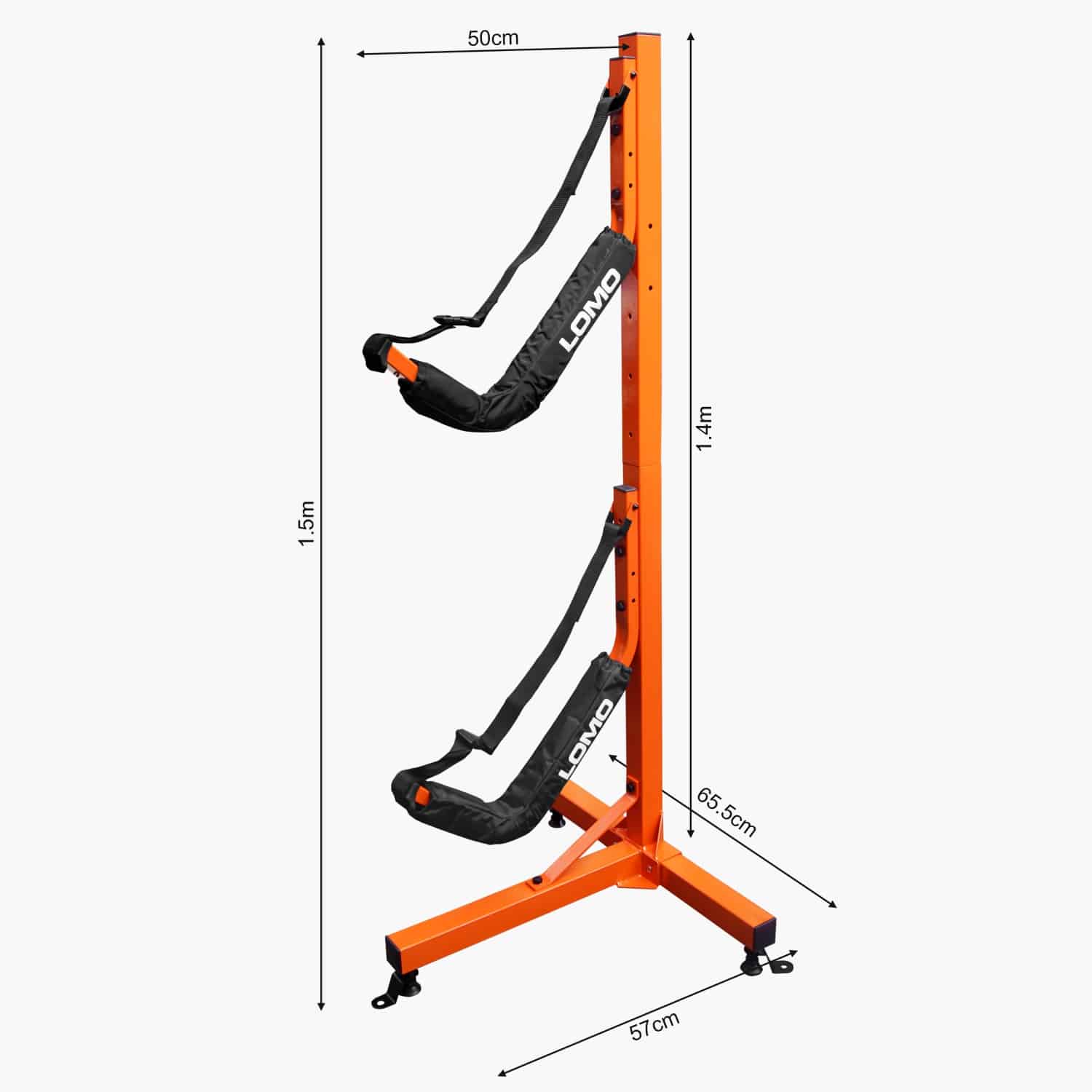 This Floor Standing 2 Kayak Rack is free standing and can hold your kayaks, SUP boards and surfboards.