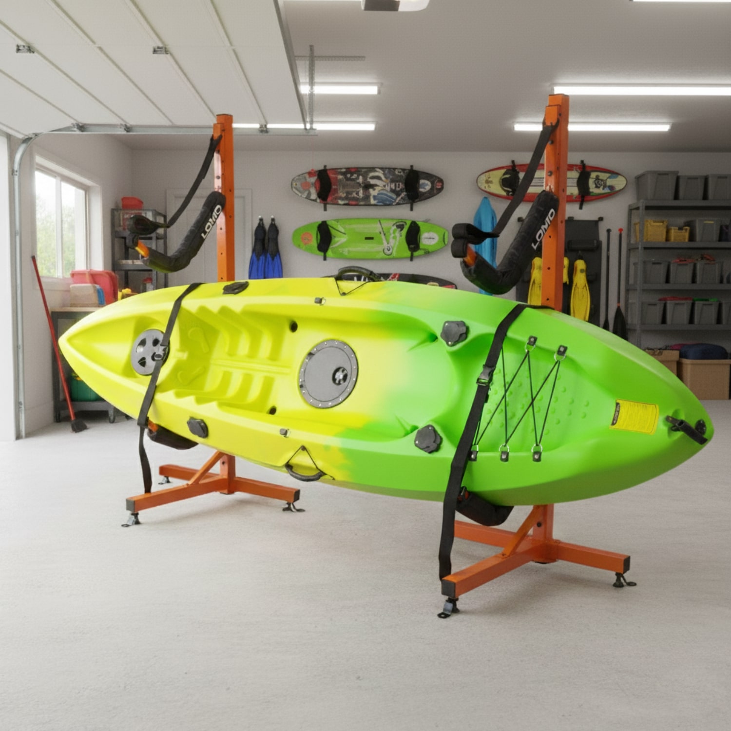 Our floor standing 2 kayak rack is a brilliant indoor space saving device and will help declutter your garage or shed while turning your kayaks into a tidy display.